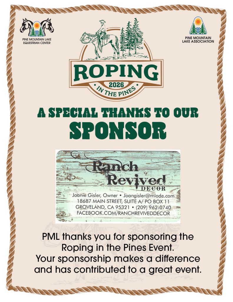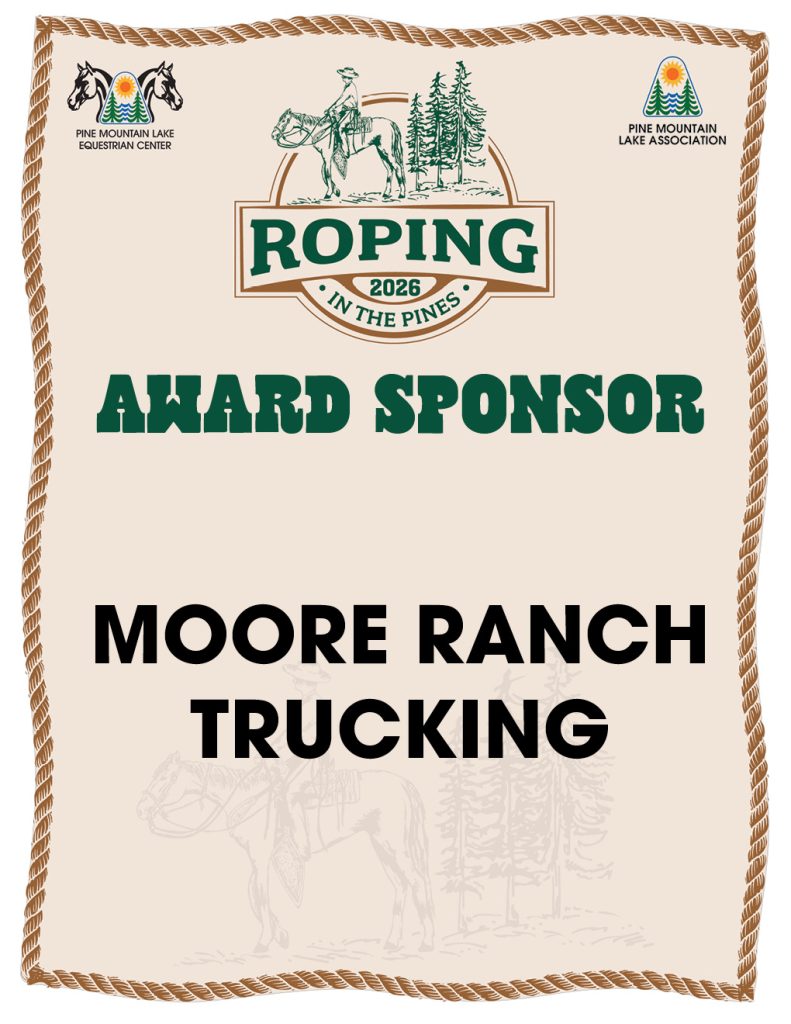 Roping in the Pines would not be possible without the generous support of our sponsors. Their commitment to our event helps us provide a quality competition, great awards, and a memorable Memorial Day Weekend for contestants and spectators alike. We are proud to partner with businesses and individuals who support the western way of life and our local community.